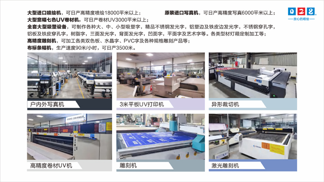 四川零貳捌廣告有限公司有著自己的設(shè)計(jì)團(tuán)隊(duì)和制作加工工廠,也配備著新的各類(lèi)廣告制作的加工機(jī)械,比如噴繪機(jī)、裁剪機(jī)、UV打印機(jī)、雕刻機(jī)等等。